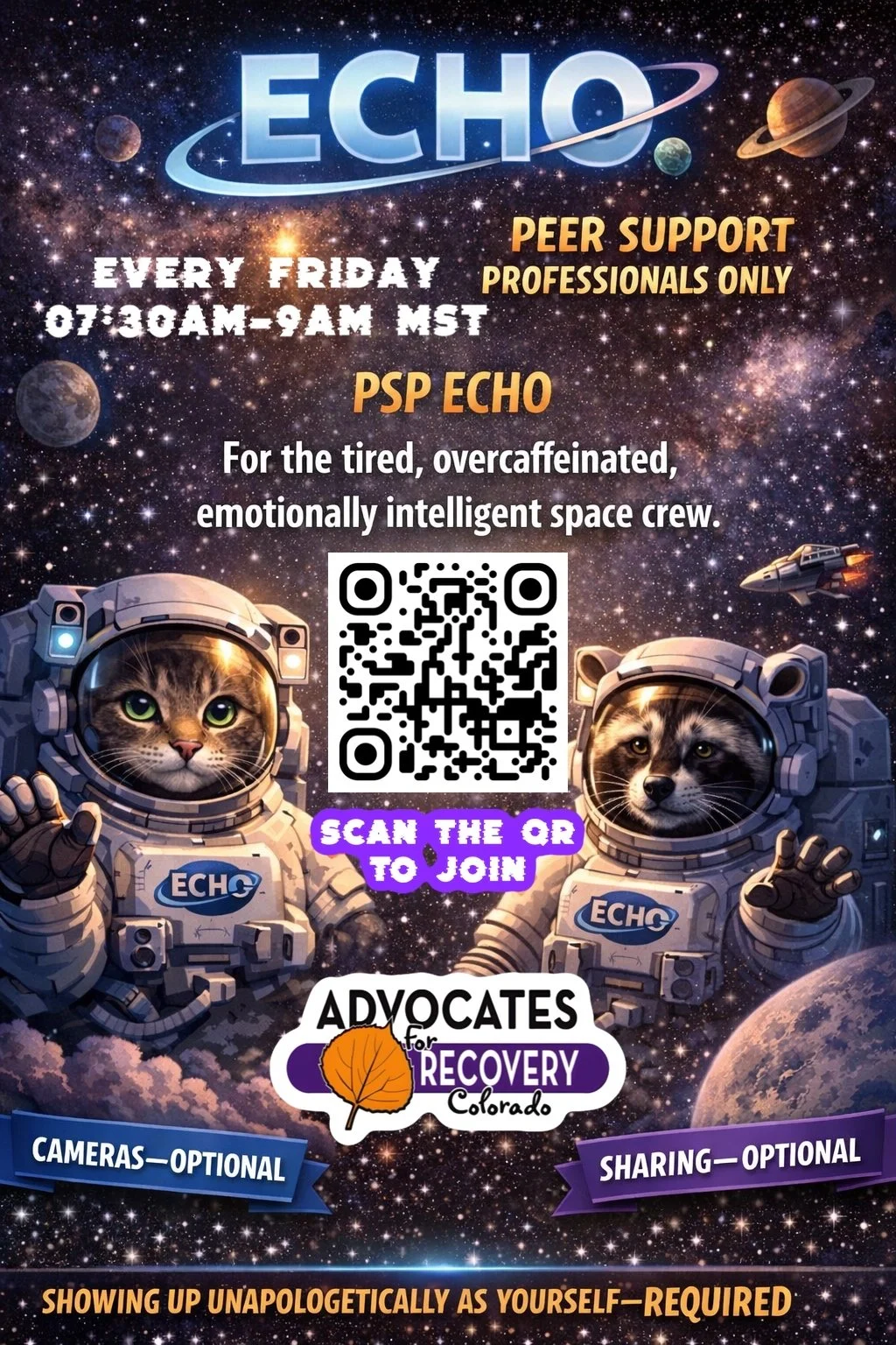 ECHO is meant for Peer workers from all walks (recovery, mental health, unhoused, veteran, etc.) to come together for support, networking, resources, and collaboration. This is a brave place where we are given the space to vent, ask questions, and be there for one another.