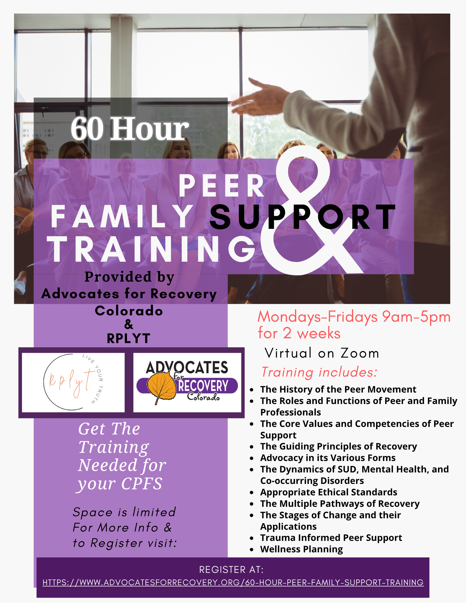 Advocates for Recovery Colorado and Robyn Priest Live Your Truth are thrilled to present an all-inclusive training program tailored for aspiring Colorado Peer Support Professionals and Family Support Specialists. This comprehensive training encompasses all required hours for the Colorado Peer & Family Specialist (CPFS) certification.