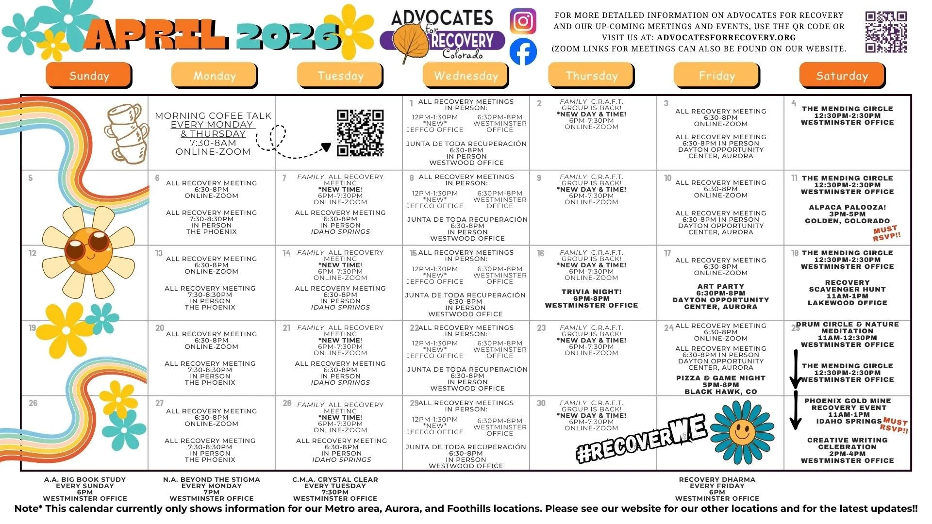 The 2nd Annual Recovery Community Resource Fair presented by Advocates for Recovery Colorado, Free Recovery Community, and C.H.E.F. is back and better than ever. The event will host a variety of community resources to connect with and learn about. Check back for more details as the event gets closer